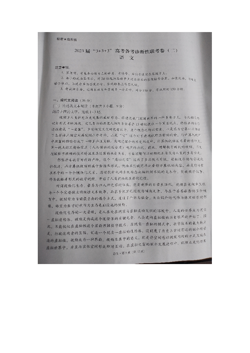 高三语文--贵州省2023届3+3+3高考备考诊断性联考(二)