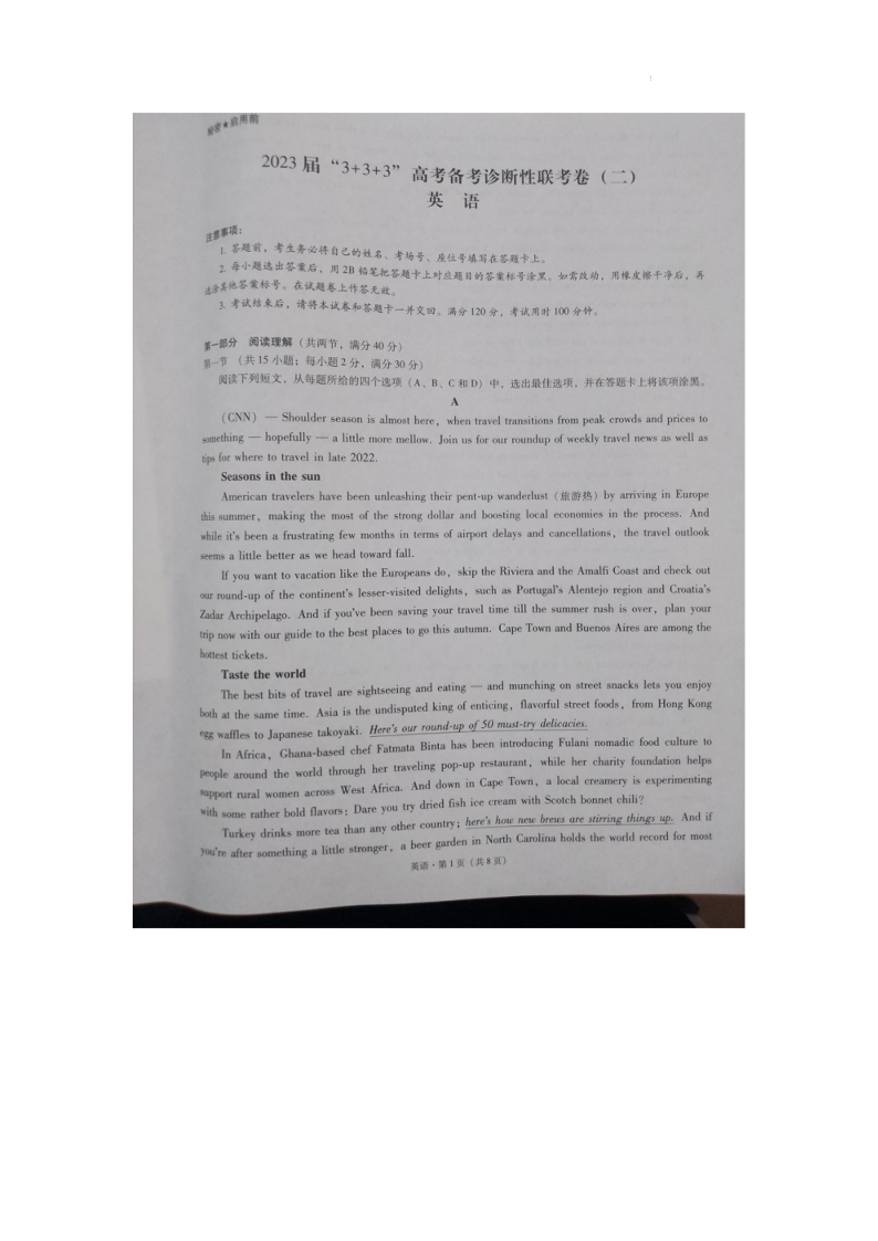 高三英语--贵州省2023届3+3+3高考备考诊断性联考(二)