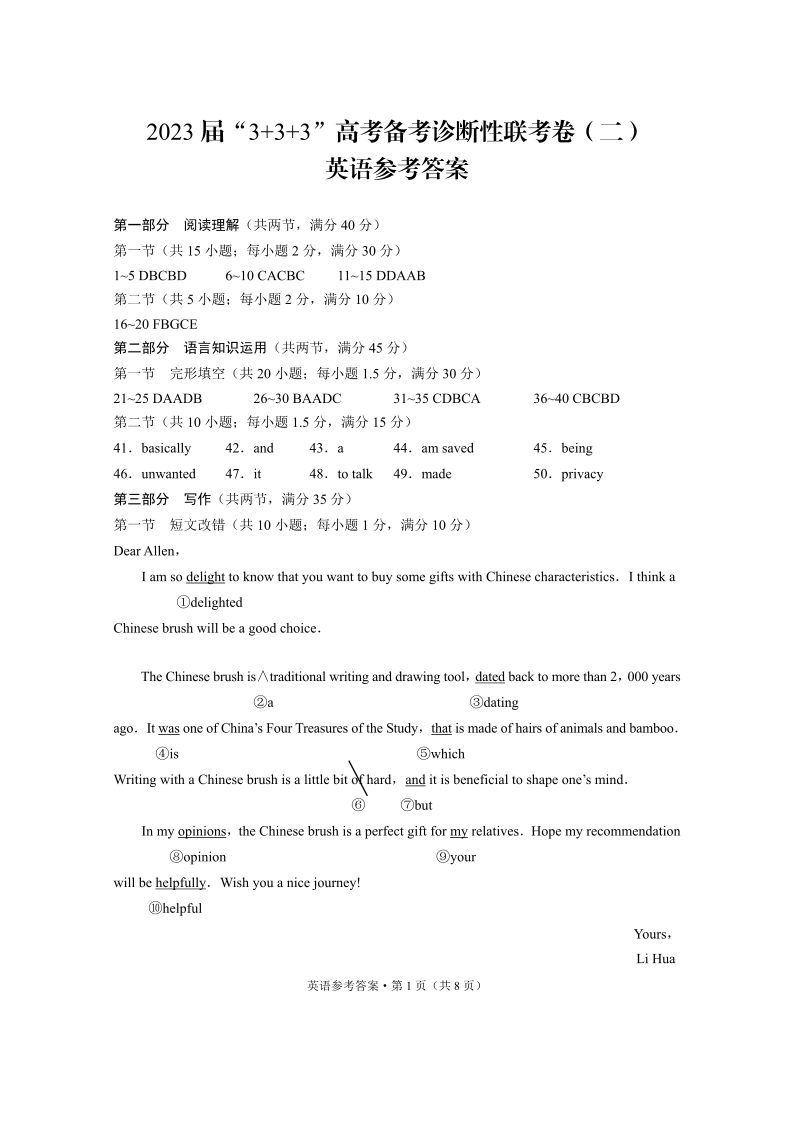 高三英语答案--贵州省2023届3+3+3高考备考诊断性联考(二)