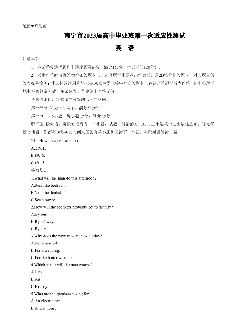 高三英语--广西壮族自治区南宁市2023届高中毕业班第一次适应性测试