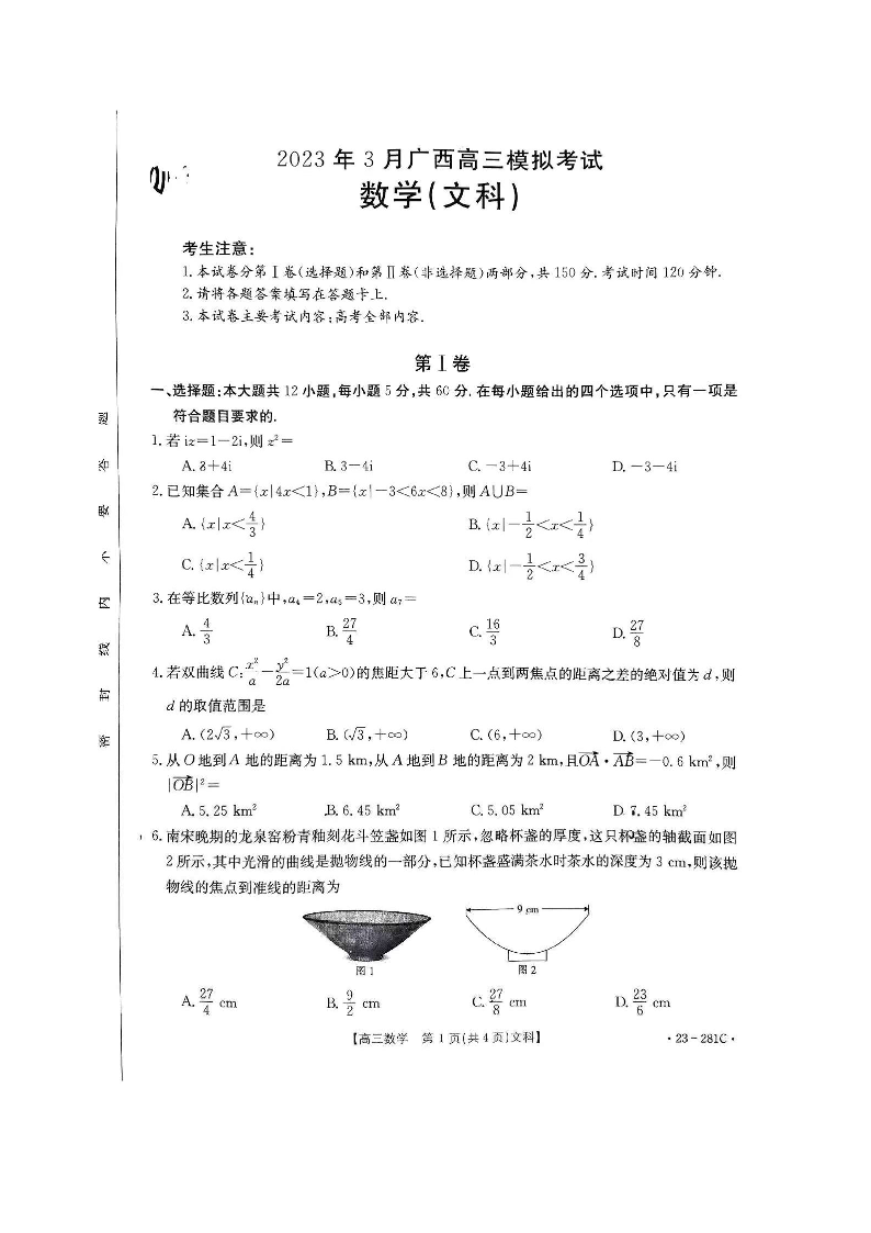 高三文数--广西梧州市2023年3月高三模拟考试(梧州二模)