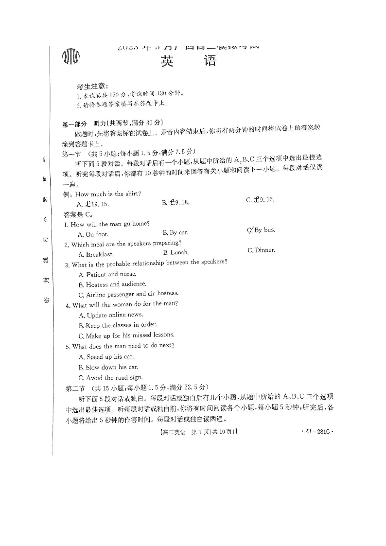 高三英语--广西梧州市2023年3月高三模拟考试(梧州二模)