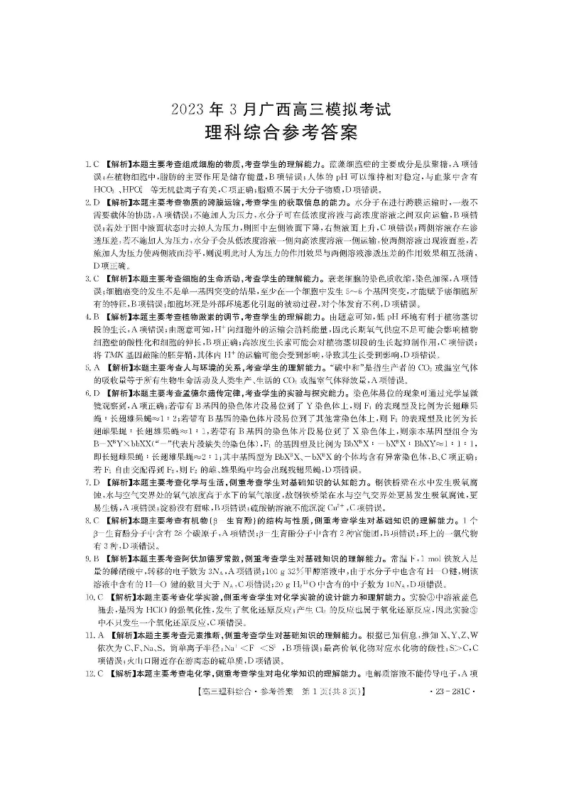 高三理综答案--广西梧州市2023年3月高三模拟考试(梧州二模)