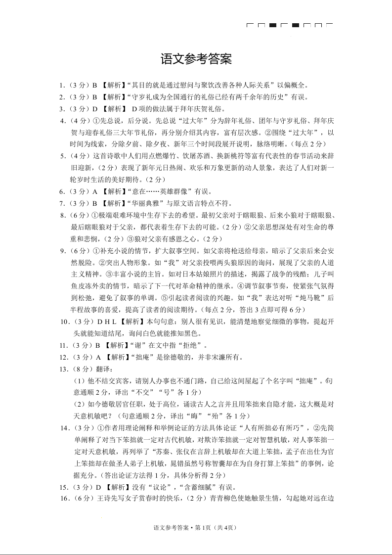 高三语文答案--云南师范大学附属中学2022-2023学年高三第十次高考适应性考试