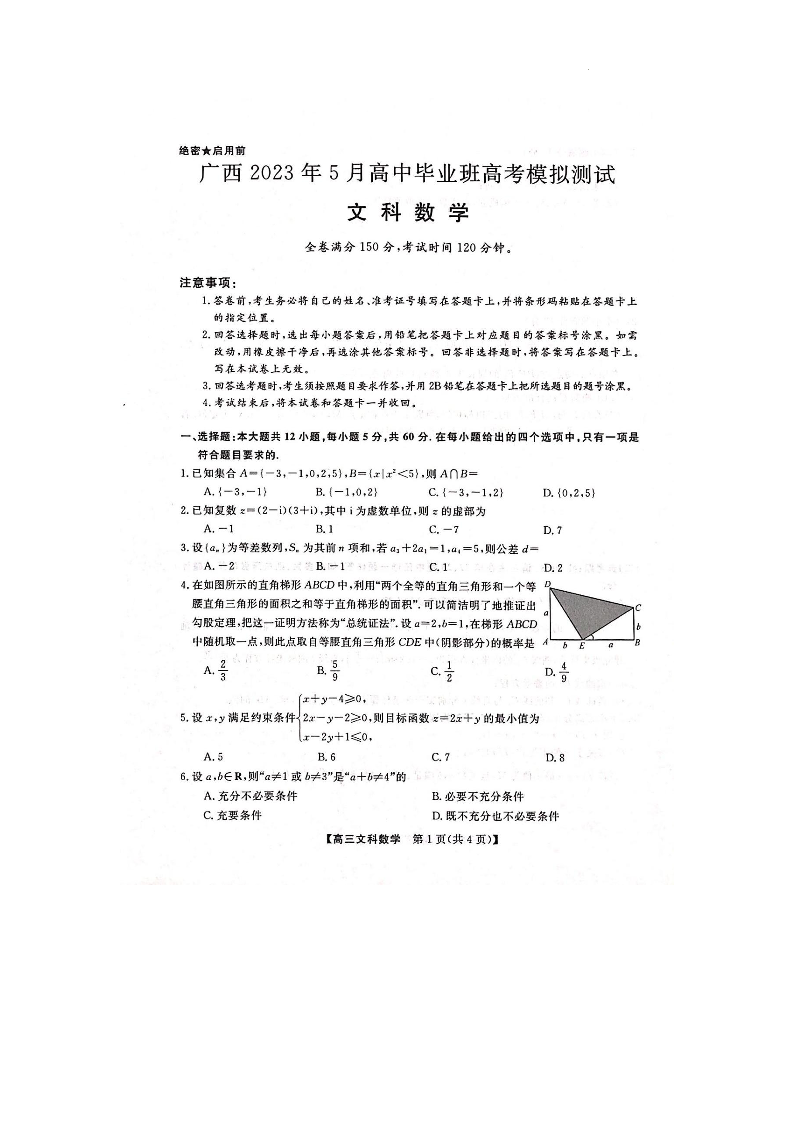 高三文数--广西2023年5月高中毕业班高考模拟测试(三模)