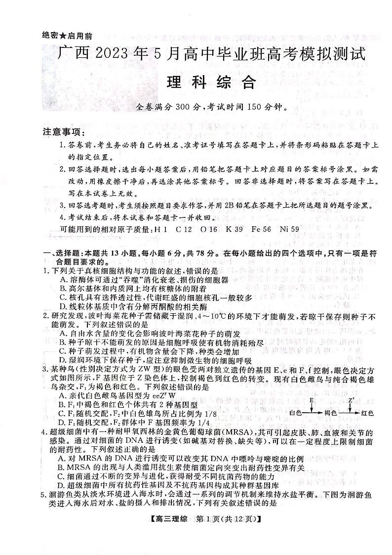高三理综--广西2023年5月高中毕业班高考模拟测试(三模)