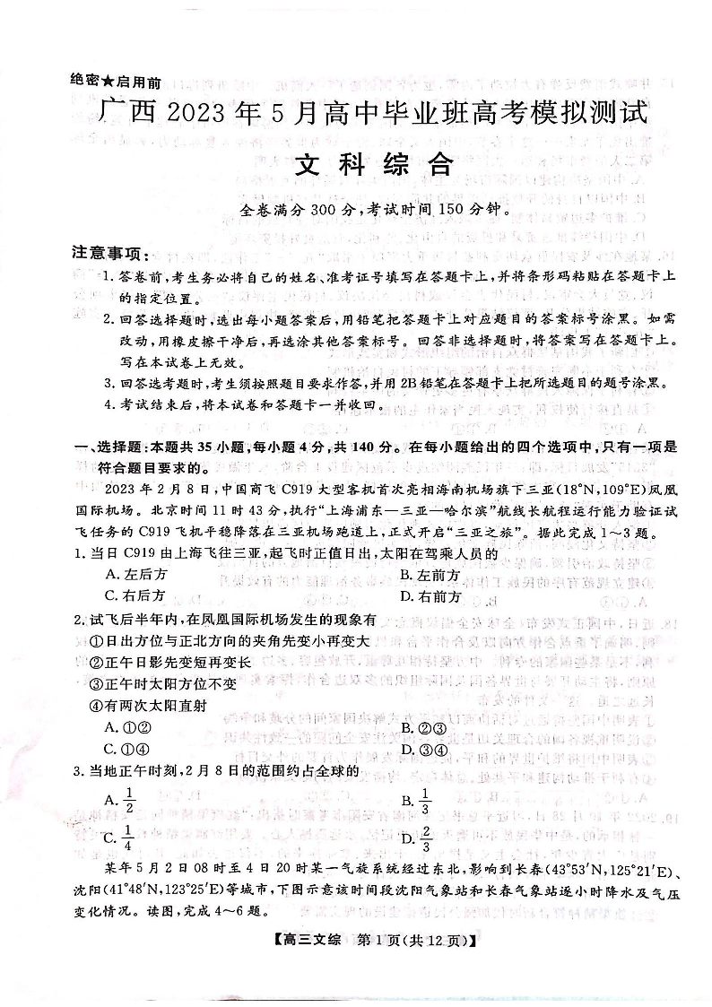 高三文综--广西2023年5月高中毕业班高考模拟测试(三模)