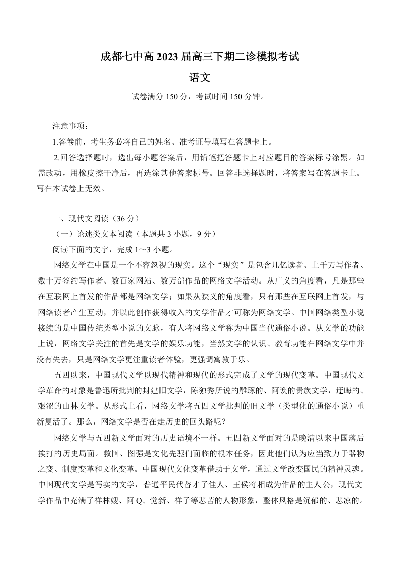 高三语文--四川省成都市第七中学2023届高三下学期二诊模拟考试