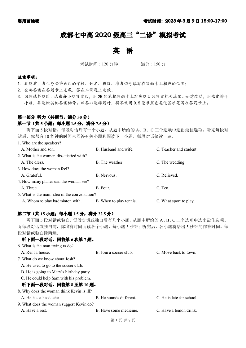 高三英语--四川省成都市第七中学2023届高三下学期二诊模拟考试