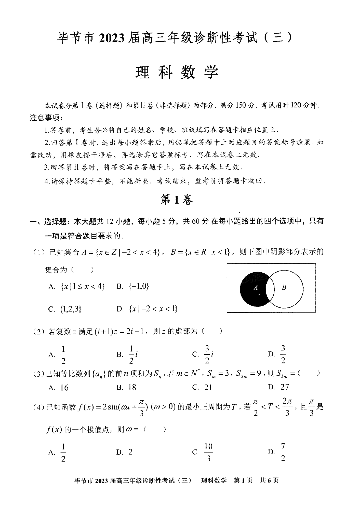 高三理数--贵州省毕节市2023届高三诊断性考试(三)(毕节三诊)