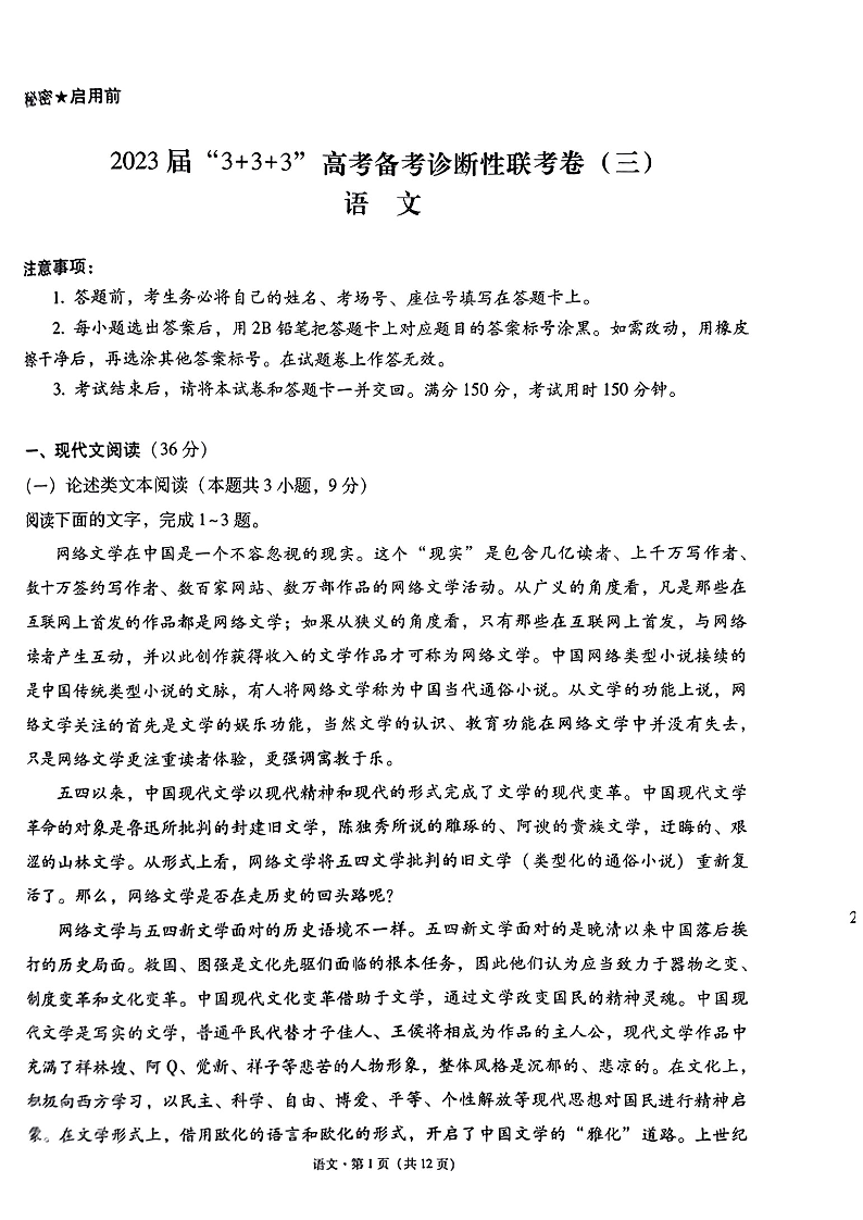 高三语文--贵州省贵阳市2023届高三3+3+3高考备考诊断性联考(三)