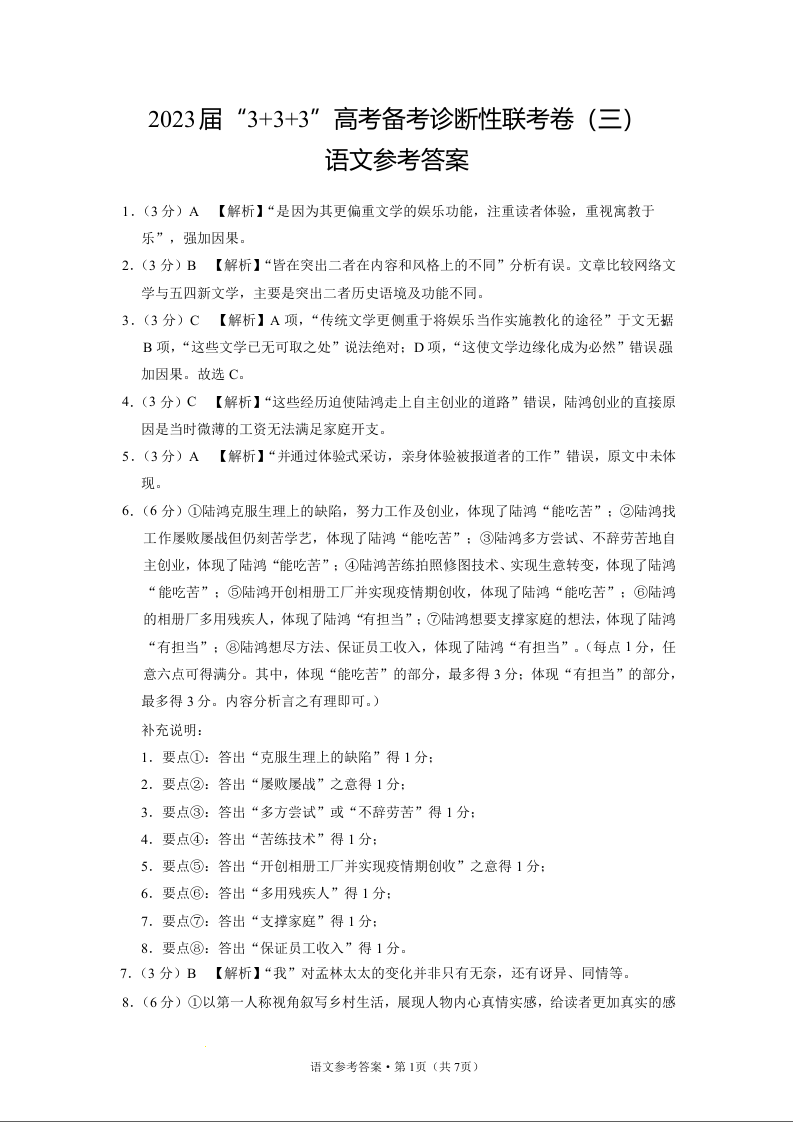 高三语文答案--贵州省贵阳市2023届高三3+3+3高考备考诊断性联考(三)