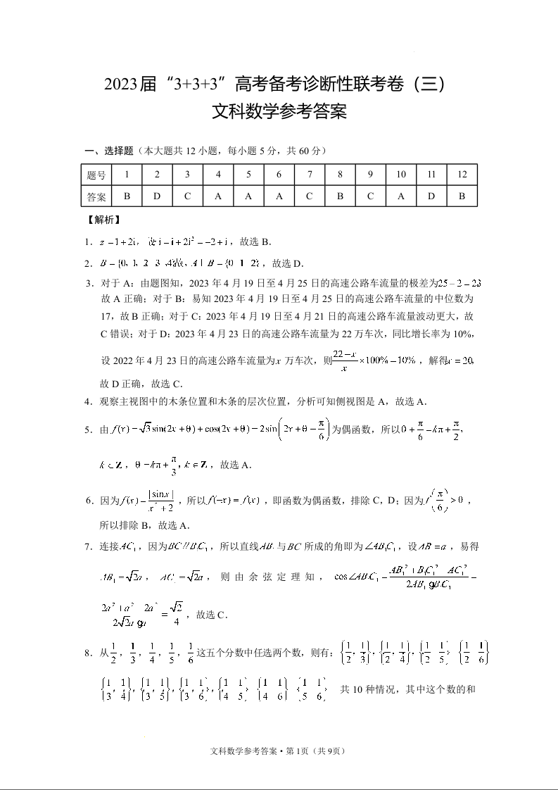 高三文数答案--贵州省贵阳市2023届高三3+3+3高考备考诊断性联考(三)