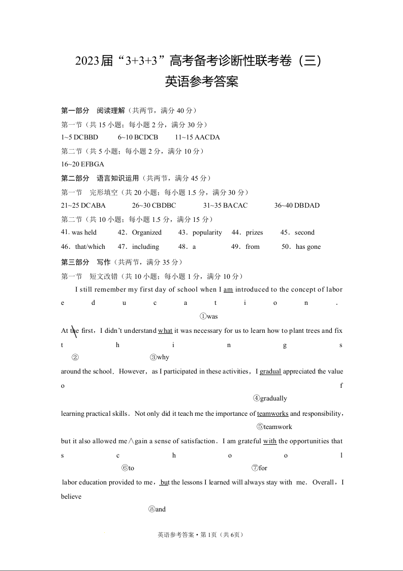 高三英语答案--贵州省贵阳市2023届高三3+3+3高考备考诊断性联考(三)