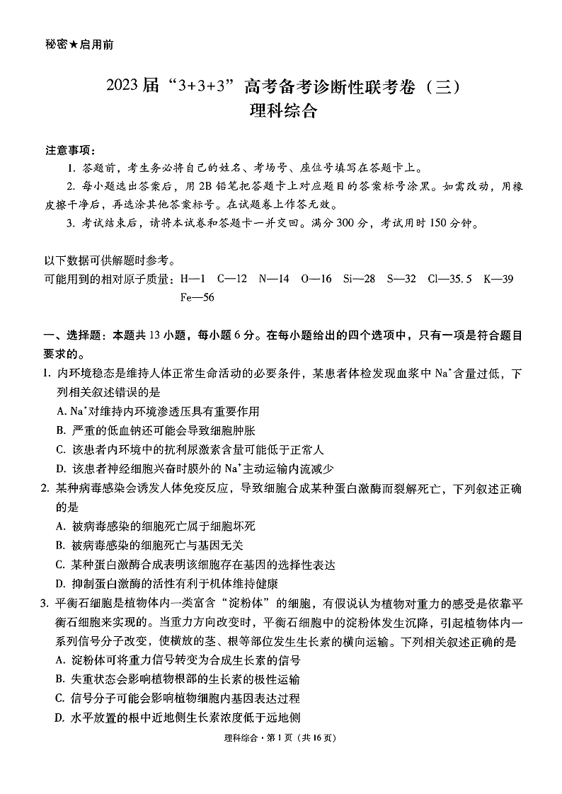 高三理综--贵州省贵阳市2023届高三3+3+3高考备考诊断性联考(三)