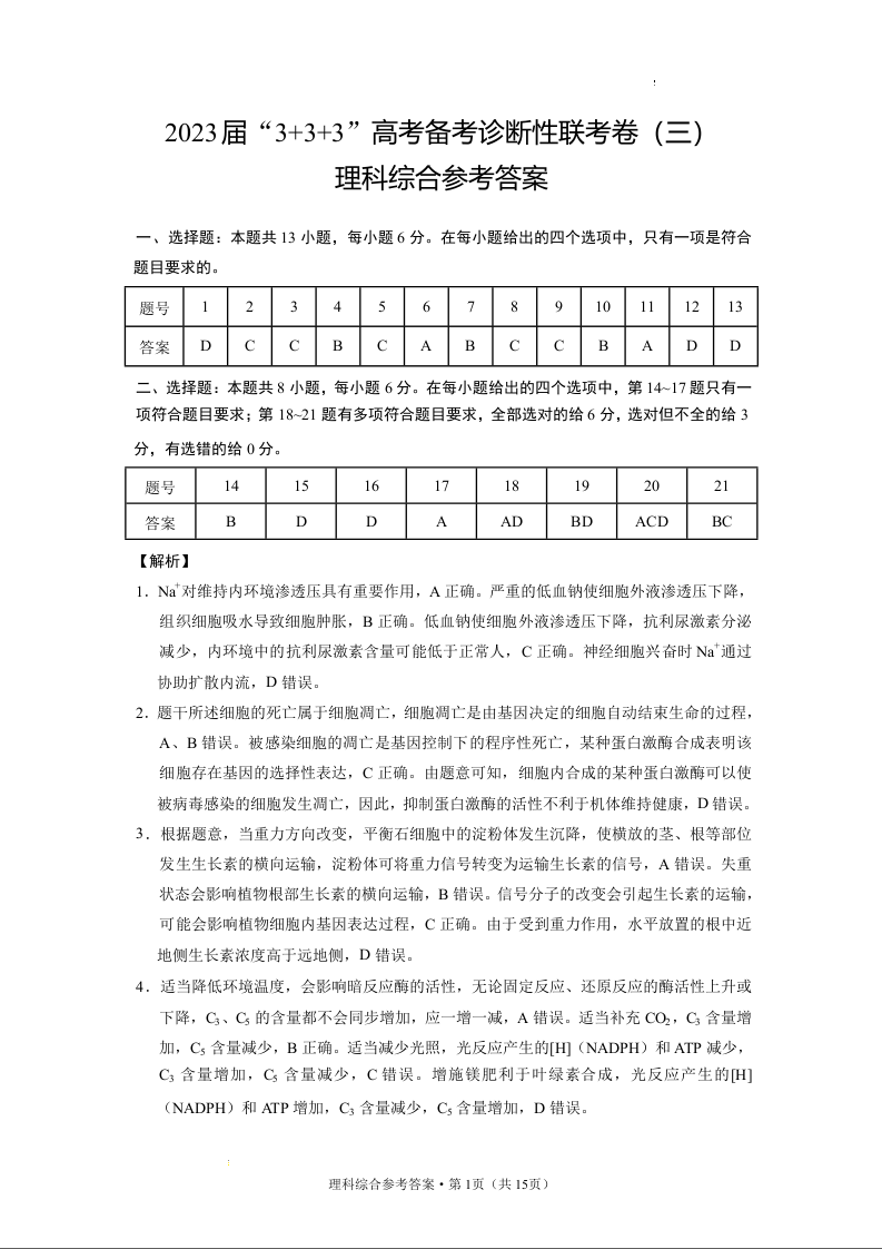高三理综答案--贵州省贵阳市2023届高三3+3+3高考备考诊断性联考(三)