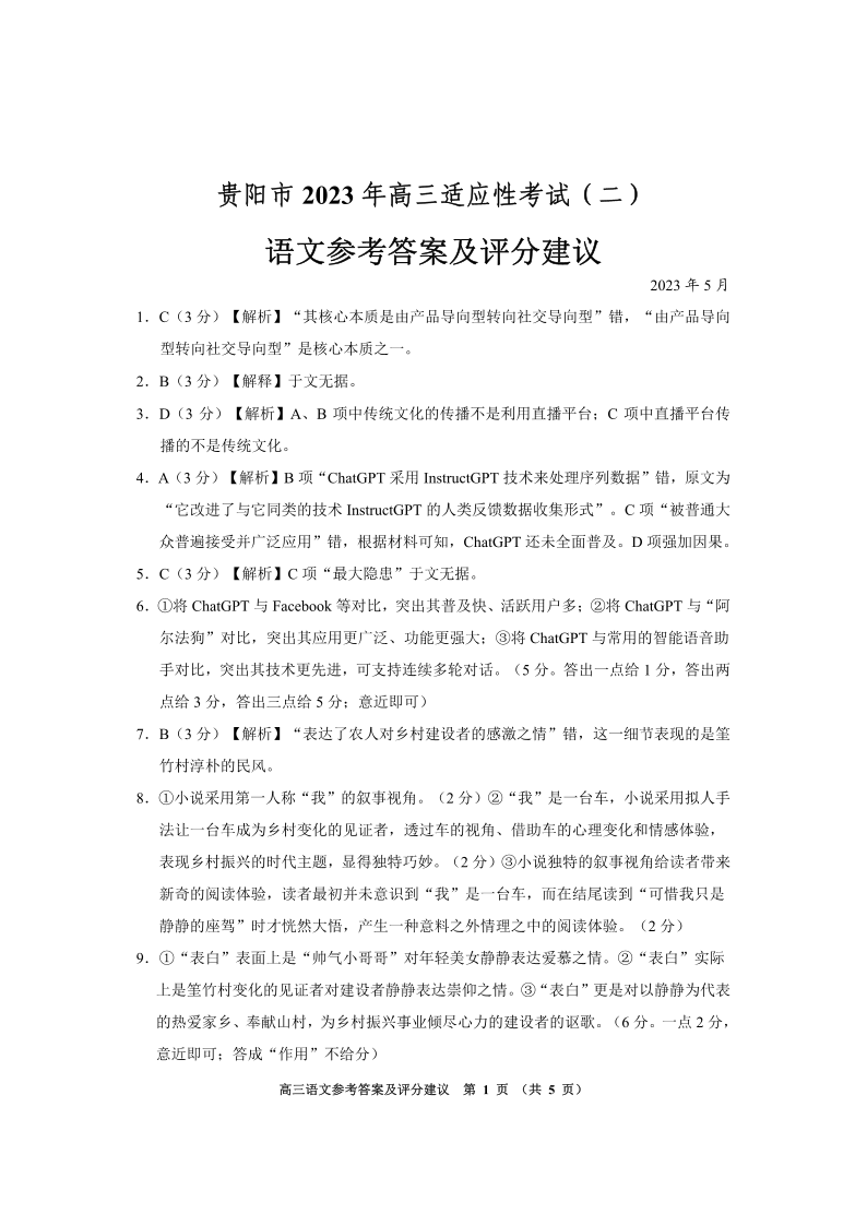 高三语文答案--贵州省贵阳市2023届高三适应性考试(二)