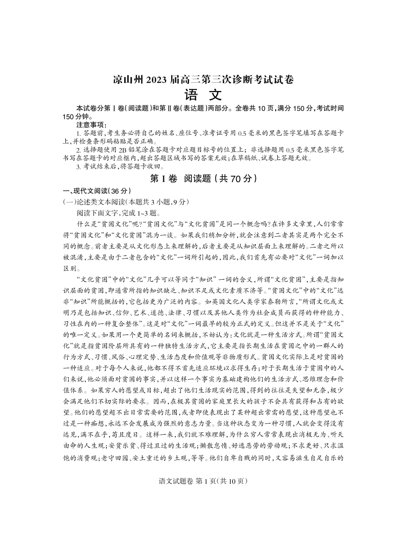 高三语文--四川省凉山彝族自治州2023届高三第三次诊断性检测