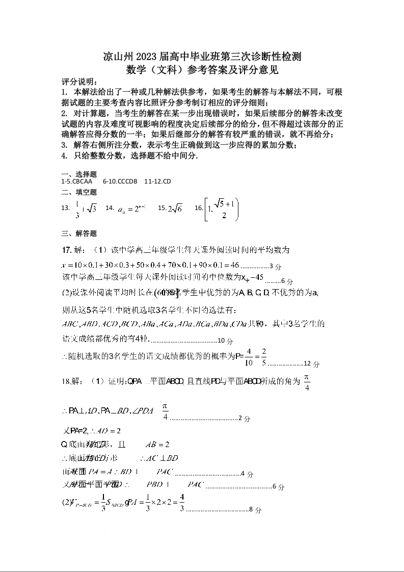 高三文数答案--四川省凉山彝族自治州2023届高三第三次诊断性检测