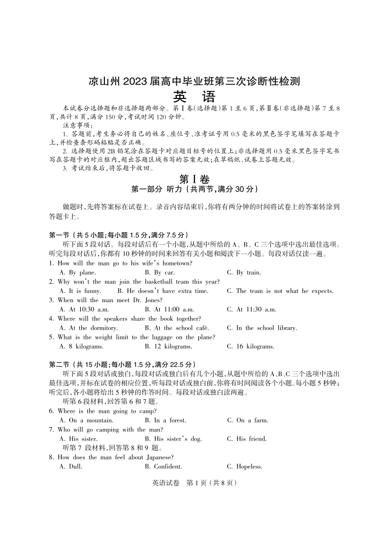 高三英语--四川省凉山彝族自治州2023届高三第三次诊断性检测