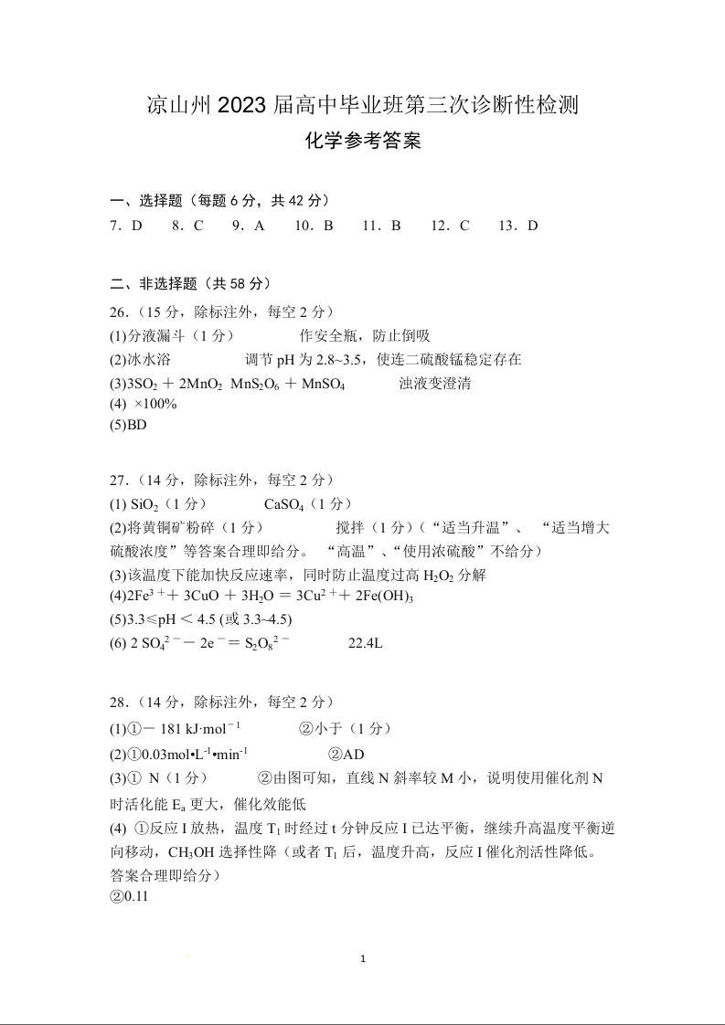高三理综化学答案--四川省凉山彝族自治州2023届高三第三次诊断性检测