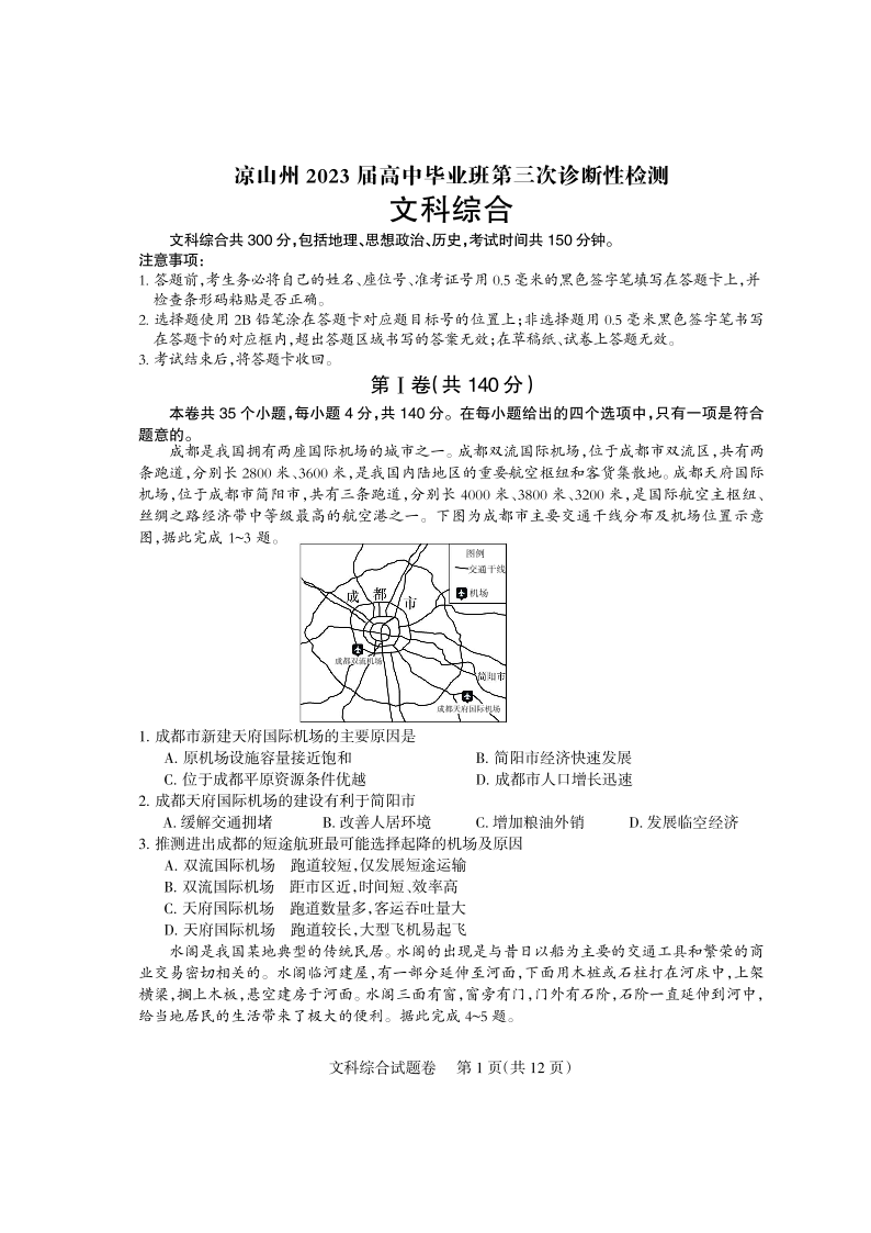 高三文综--四川省凉山彝族自治州2023届高三第三次诊断性检测