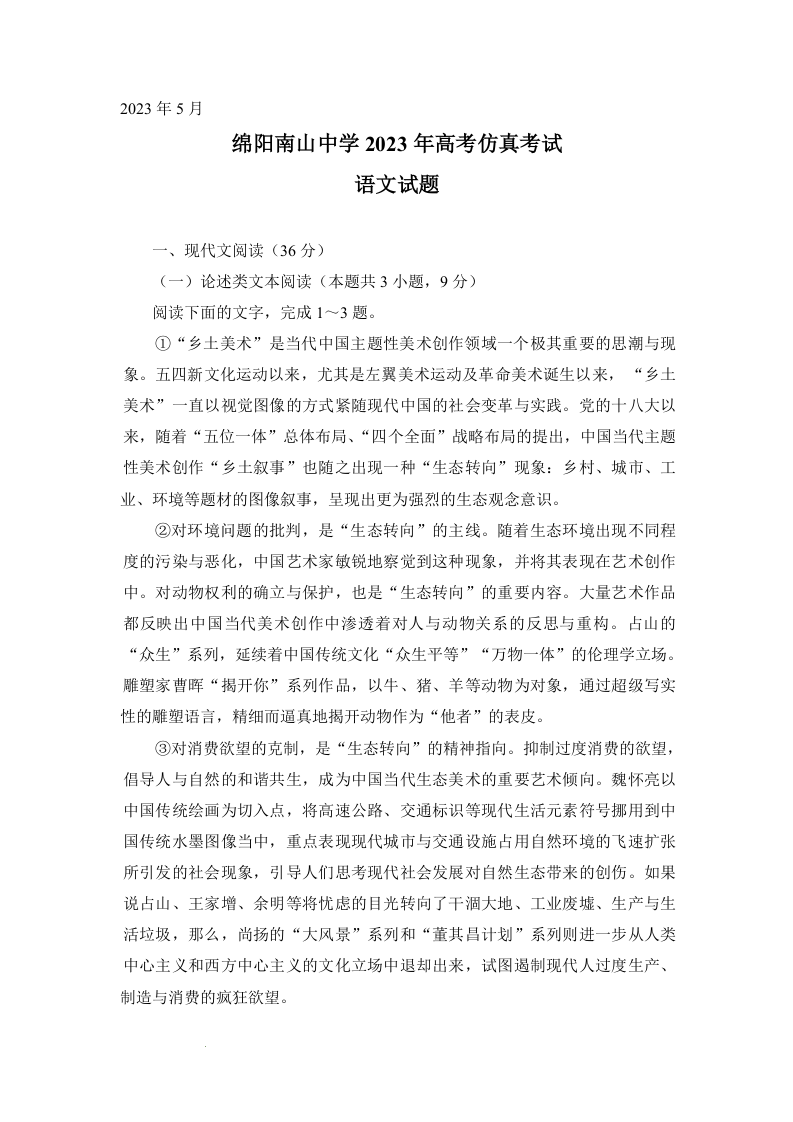高三语文+答案--四川省绵阳南山中学2023届高三下学期高考仿真考试