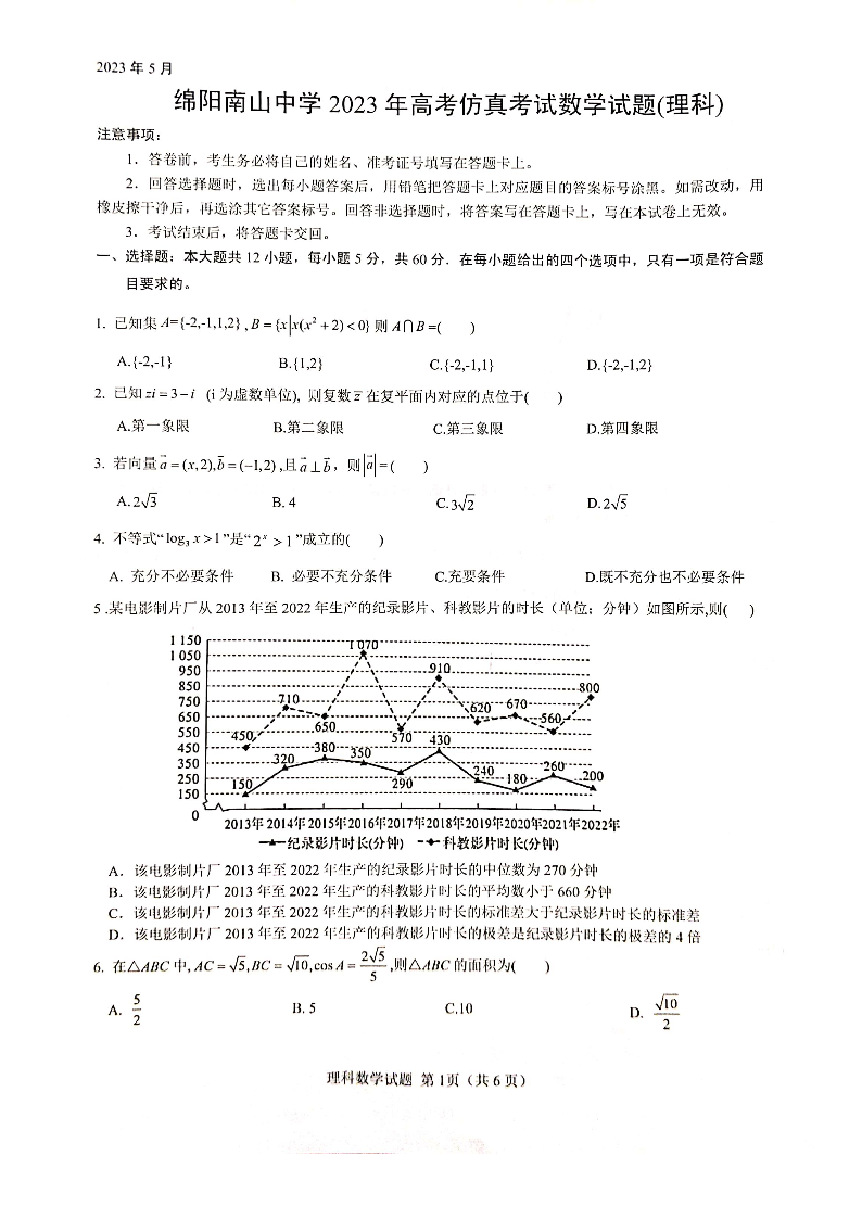高三理数+答案--四川省绵阳南山中学2023届高三下学期高考仿真考试
