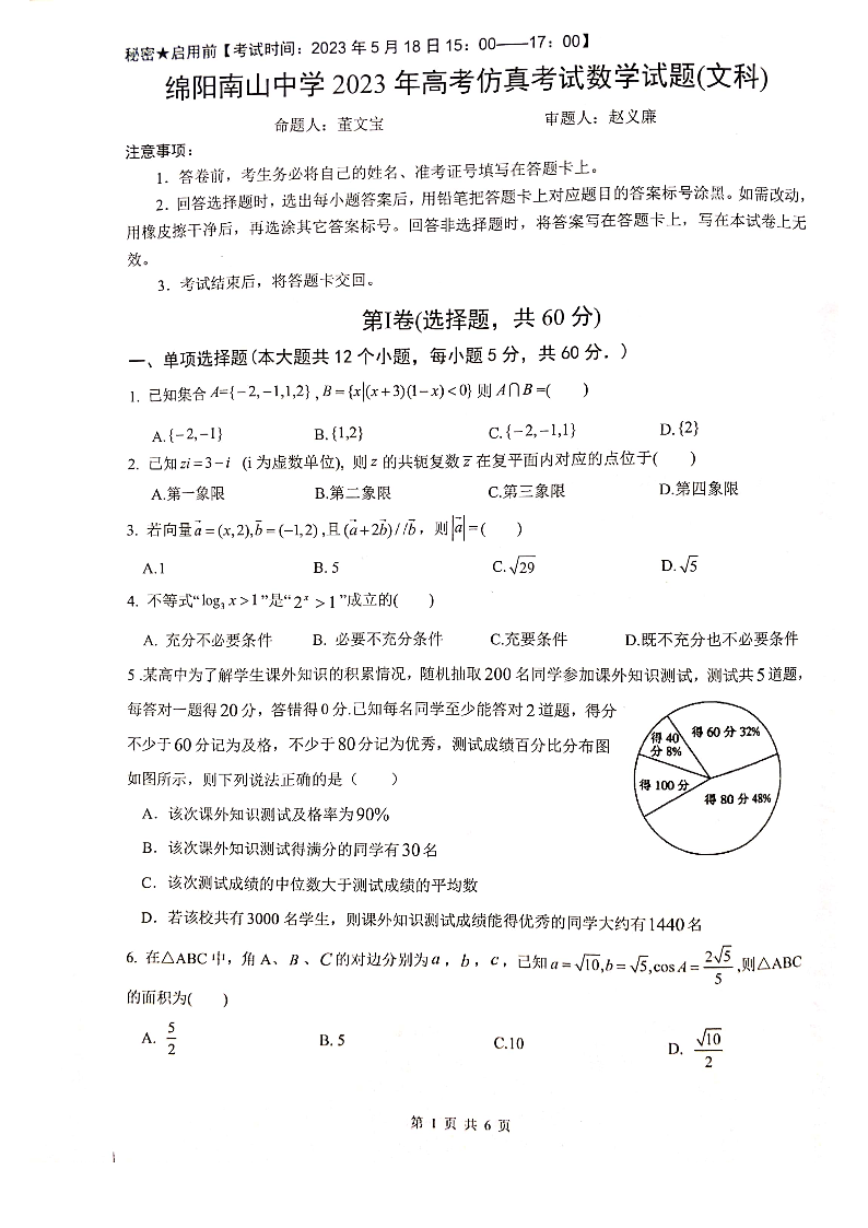 高三文数+答案--四川省绵阳南山中学2023届高三下学期高考仿真考试