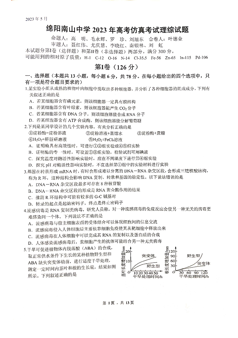 高三理综+答案--四川省绵阳南山中学2023届高三下学期高考仿真考试