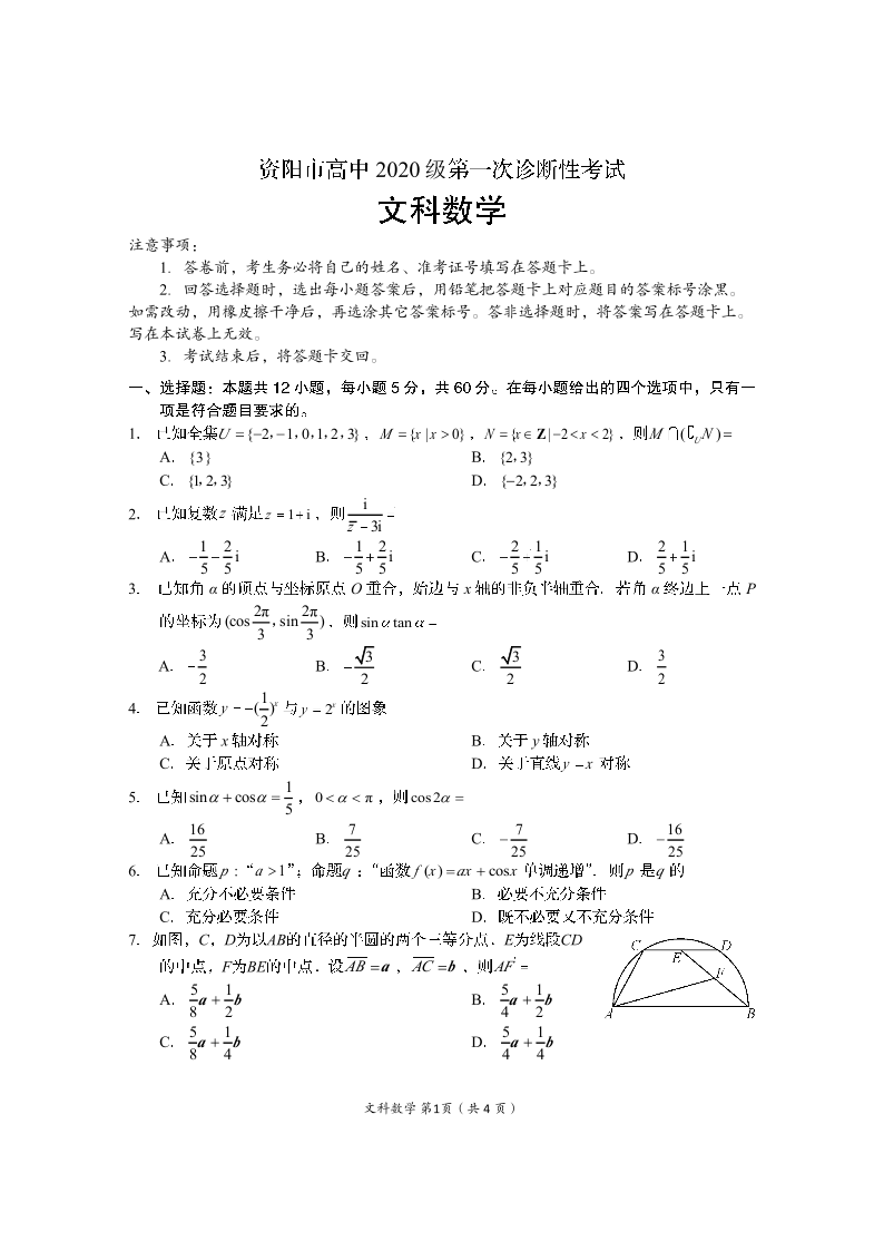 高三文数--四川省资阳市2023届高三上学期第一次诊断考试