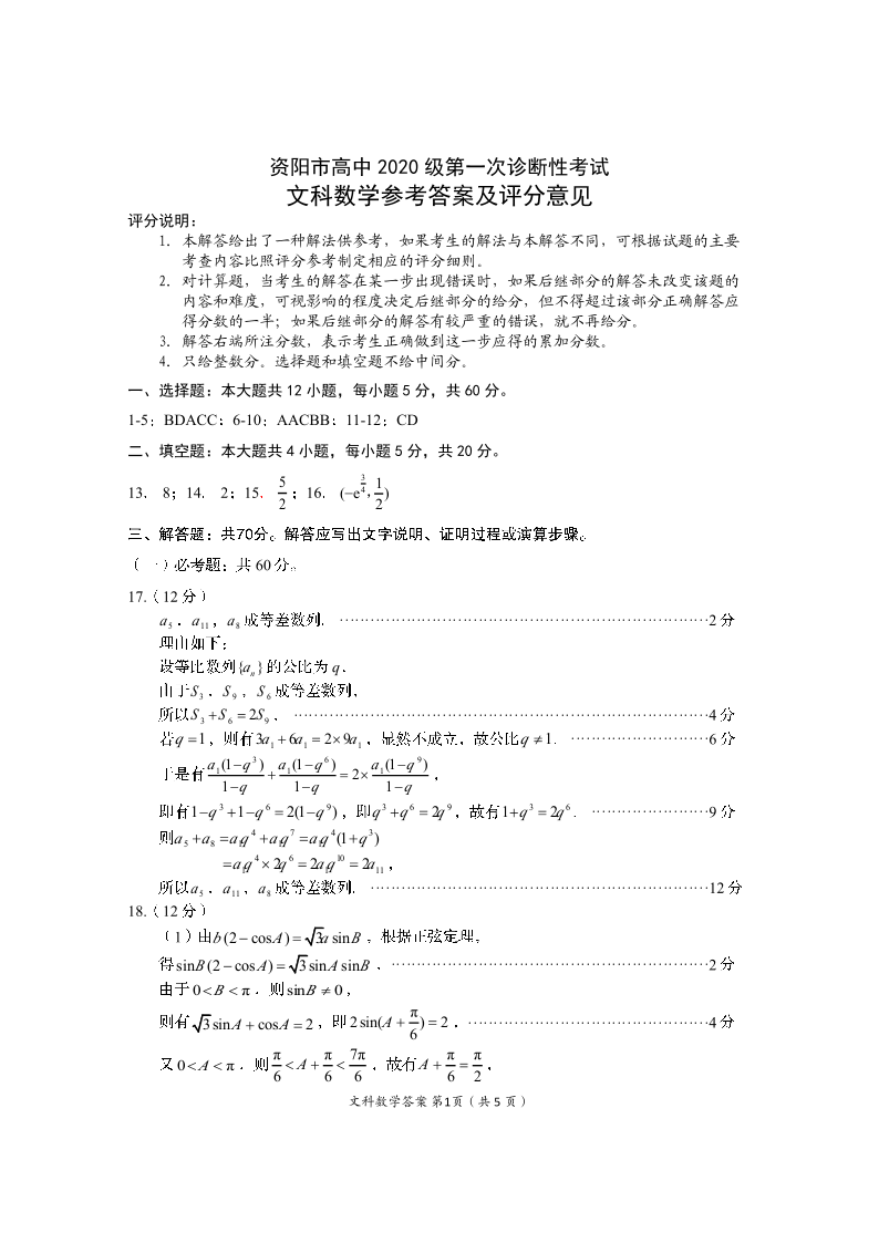 高三文数答案--四川省资阳市2023届高三上学期第一次诊断考试