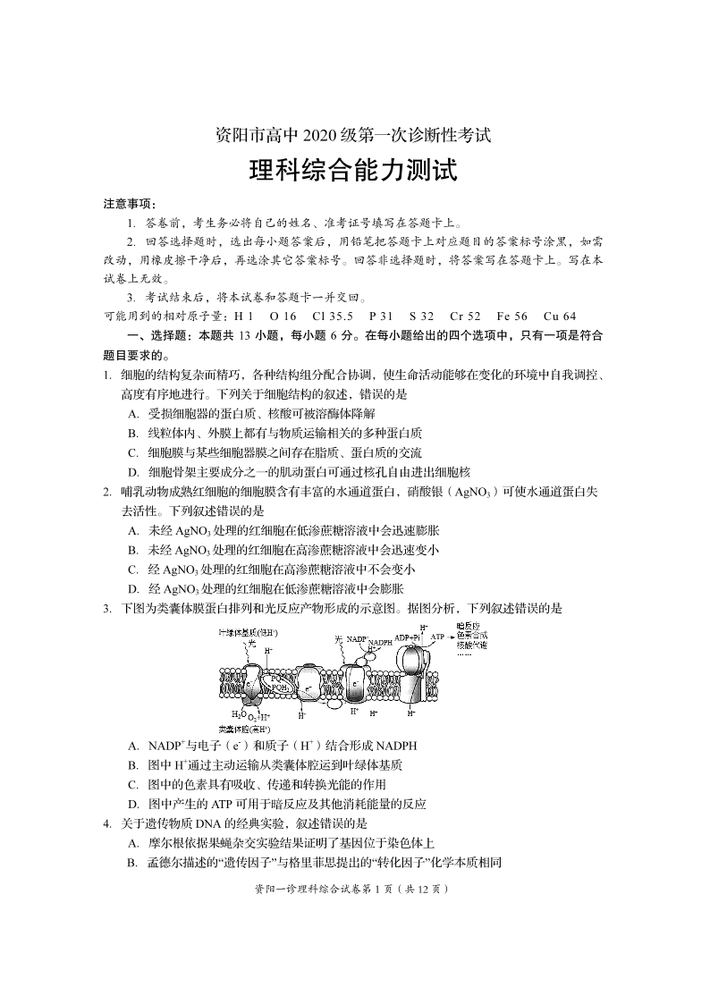 高三理综--四川省资阳市2023届高三上学期第一次诊断考试