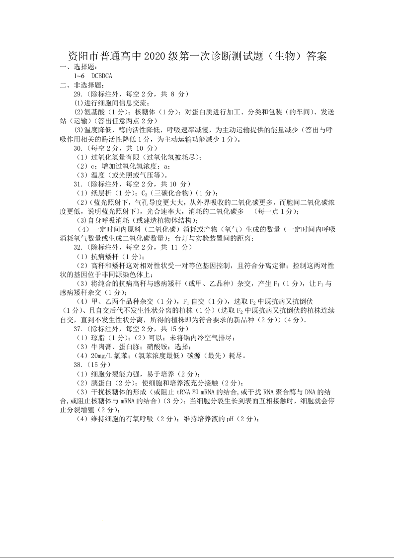 高三理综生物答案--四川省资阳市2023届高三上学期第一次诊断考试