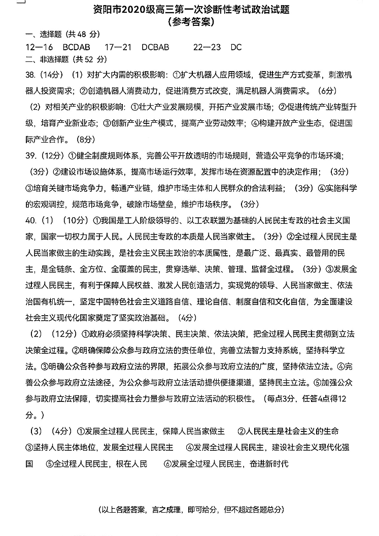 高三文综政治答案--四川省资阳市2023届高三上学期第一次诊断考试