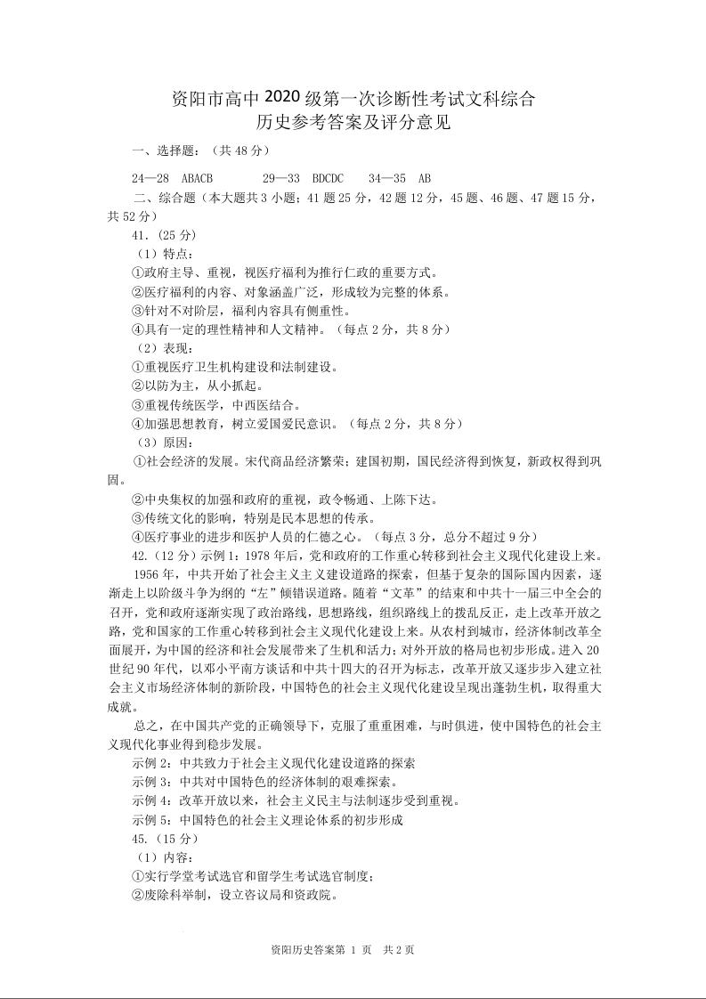 高三文综历史答案--四川省资阳市2023届高三上学期第一次诊断考试