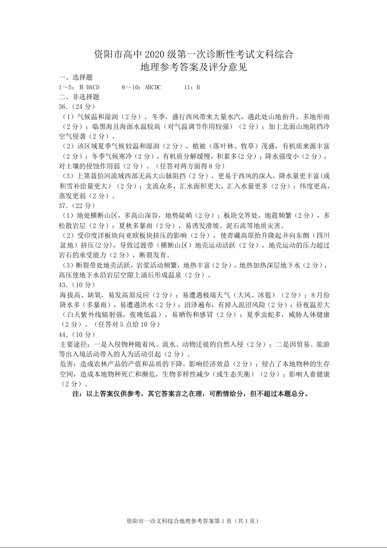 高三文综地理答案--四川省资阳市2023届高三上学期第一次诊断考试