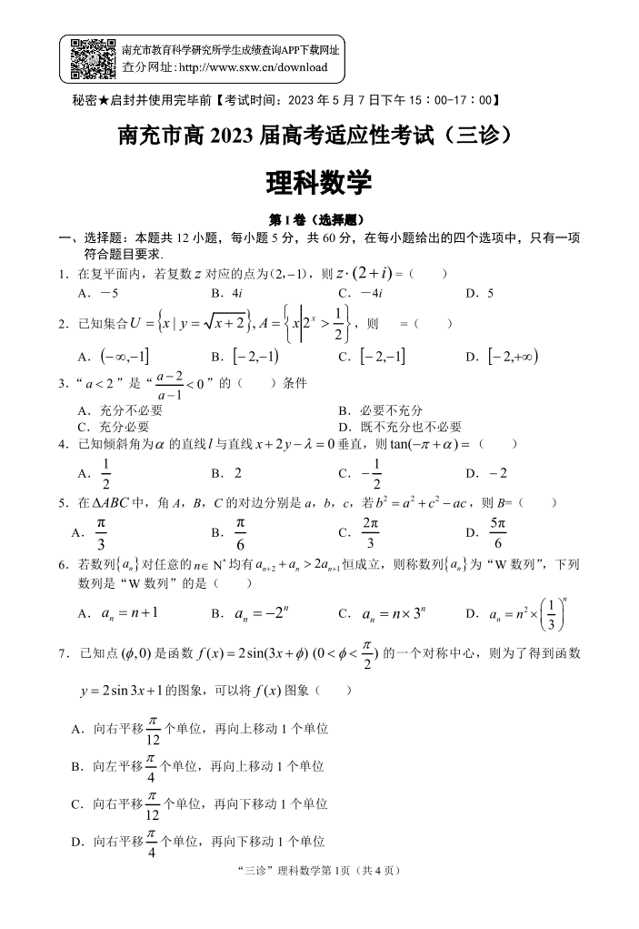 高三理数--四川省南充市高2023届高考适应性考试(南充三诊)