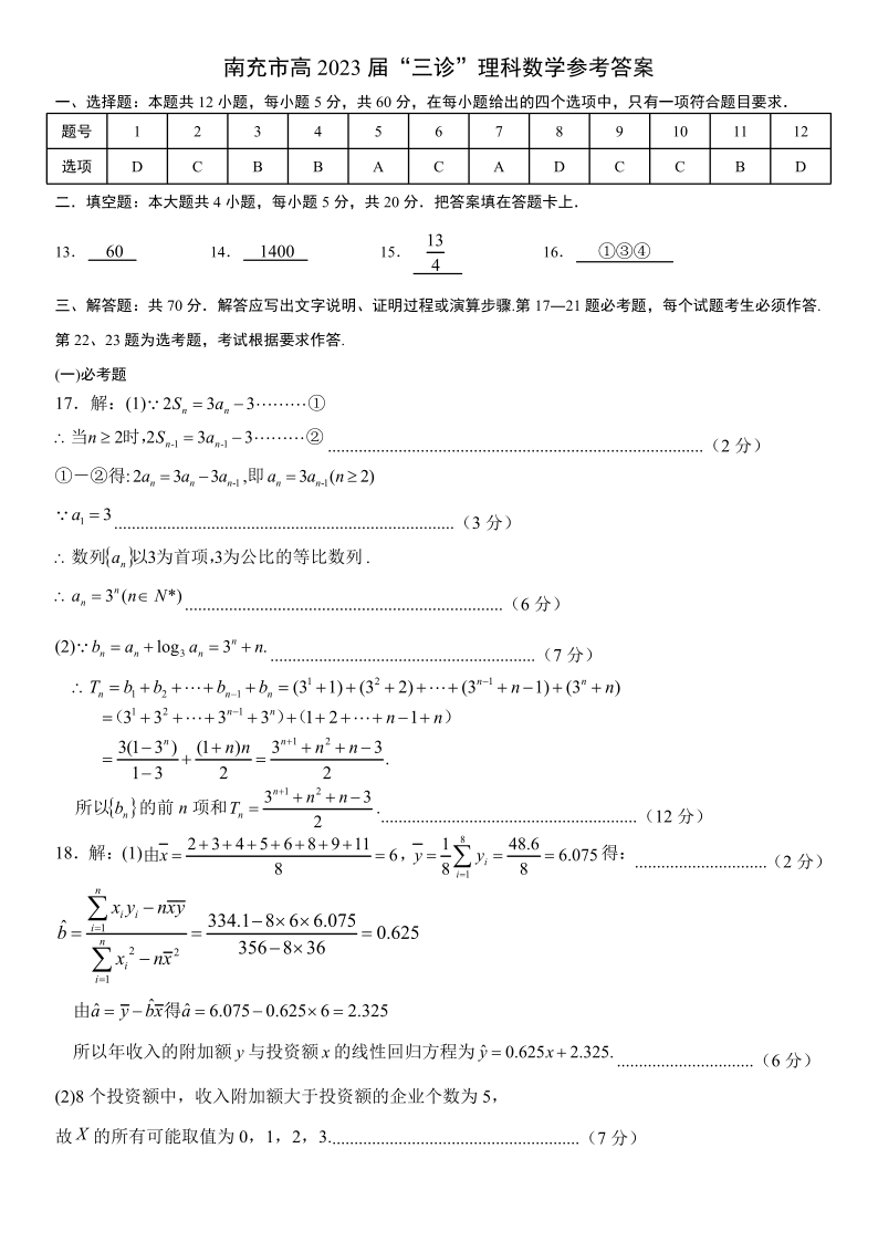 高三理数答案--四川省南充市高2023届高考适应性考试(南充三诊)