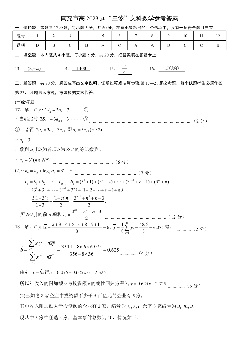 高三文数答案--四川省南充市高2023届高考适应性考试(南充三诊)