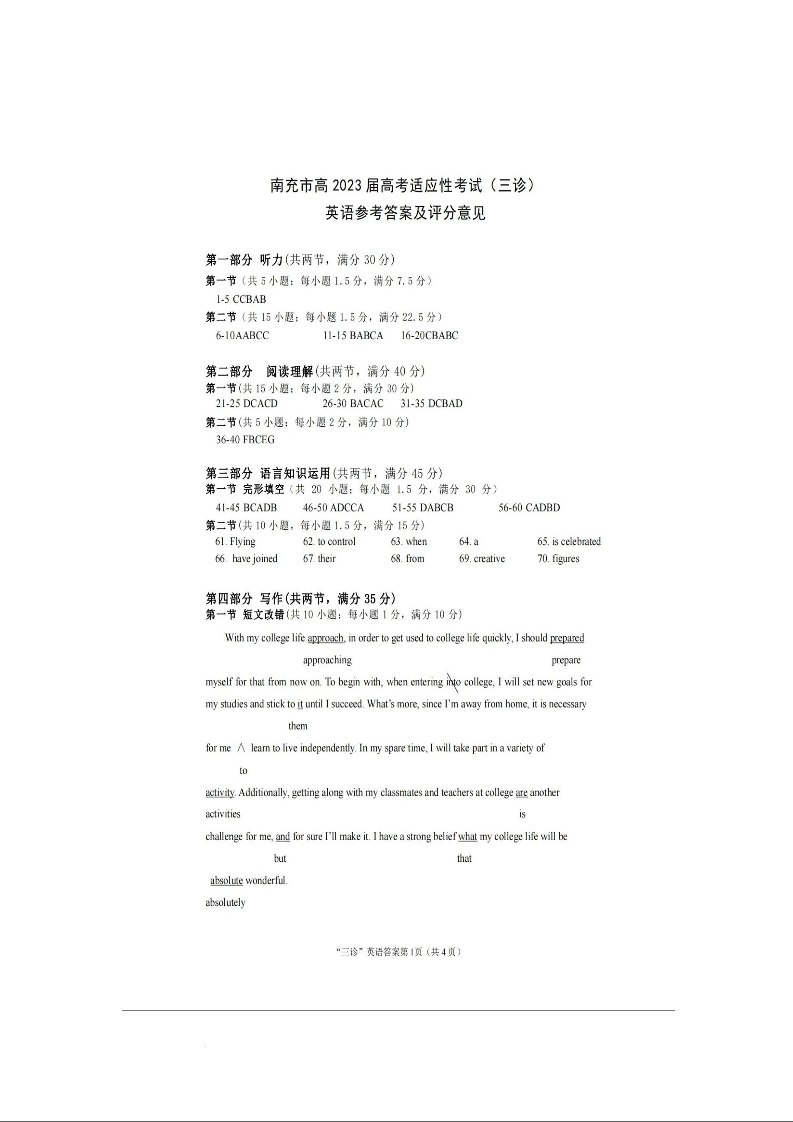 高三英语答案--四川省南充市高2023届高考适应性考试(南充三诊)