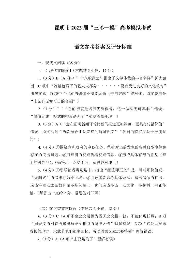 高三语文答案--云南省昆明市2023届“三诊一模”高考模拟考试(昆明二模)