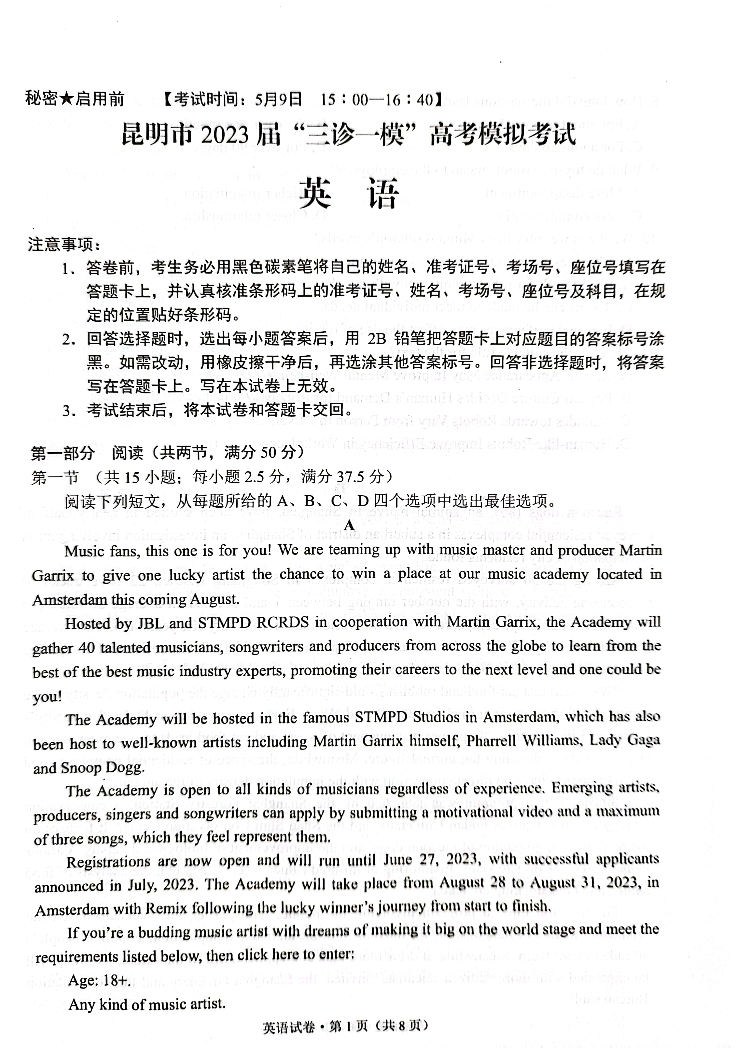高三英语--云南省昆明市2023届“三诊一模”高考模拟考试(昆明二模)
