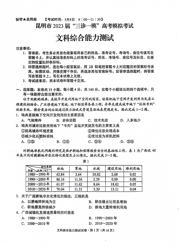 高三文综--云南省昆明市2023届“三诊一模”高考模拟考试(昆明二模)
