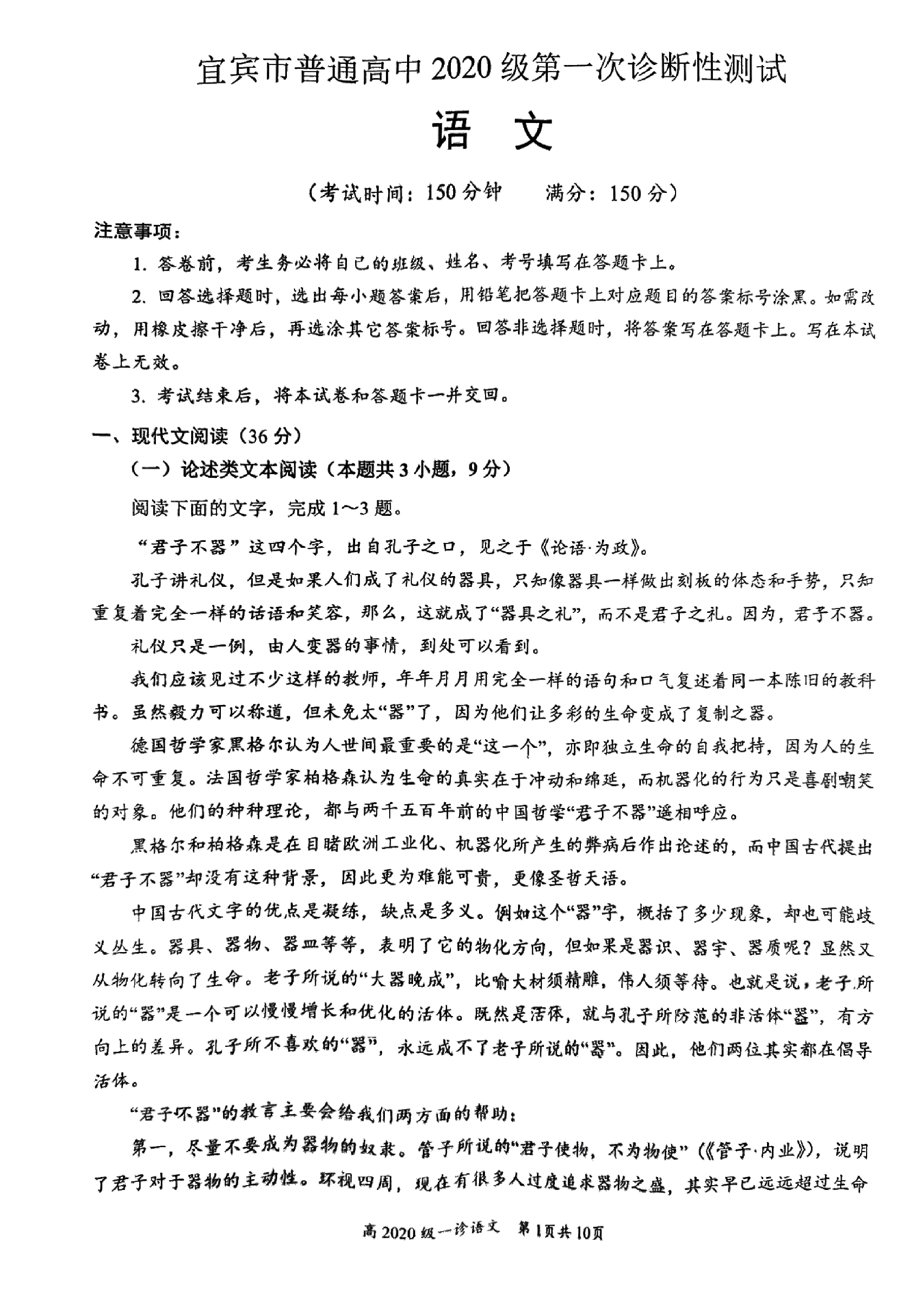 高三语文--四川省宜宾市2023届高三上学期第一次诊断测试