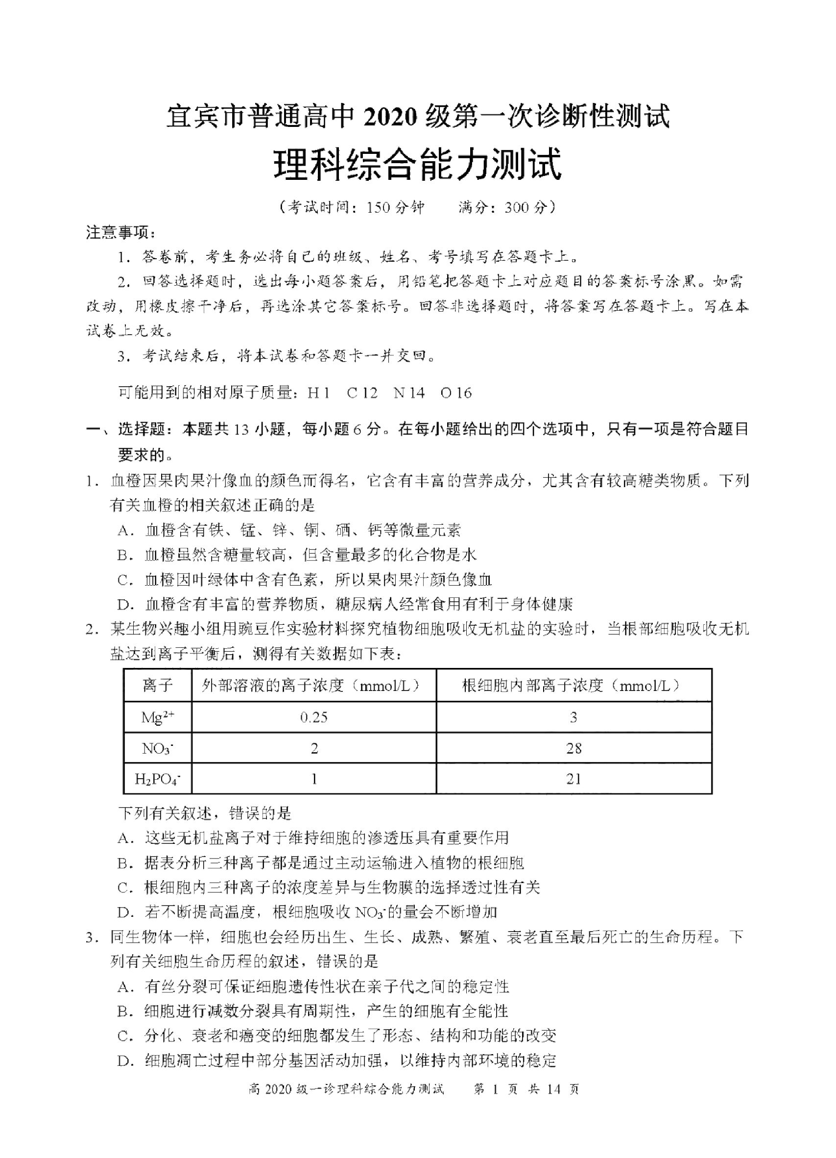 高三理综+答案--四川省宜宾市2023届高三上学期第一次诊断测试
