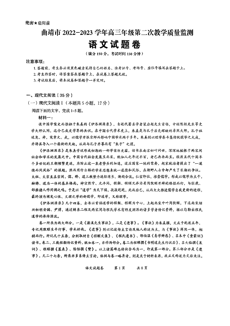 高三语文--云南省曲靖市2023届第二次教学质量检测