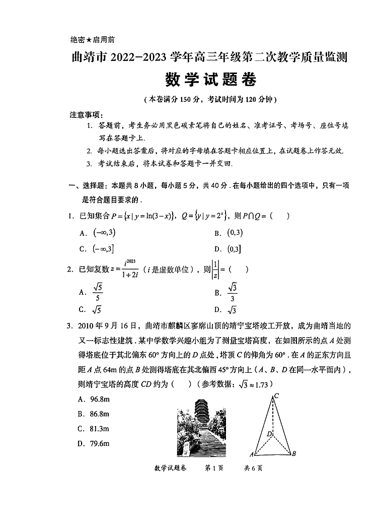 高三数学--云南省曲靖市2023届第二次教学质量检测