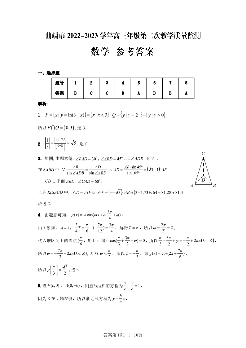 高三数学答案--云南省曲靖市2023届第二次教学质量检测