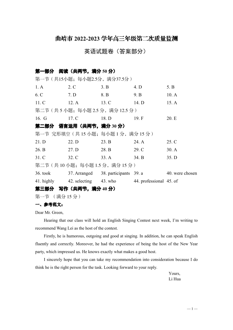 高三英语答案--云南省曲靖市2023届第二次教学质量检测